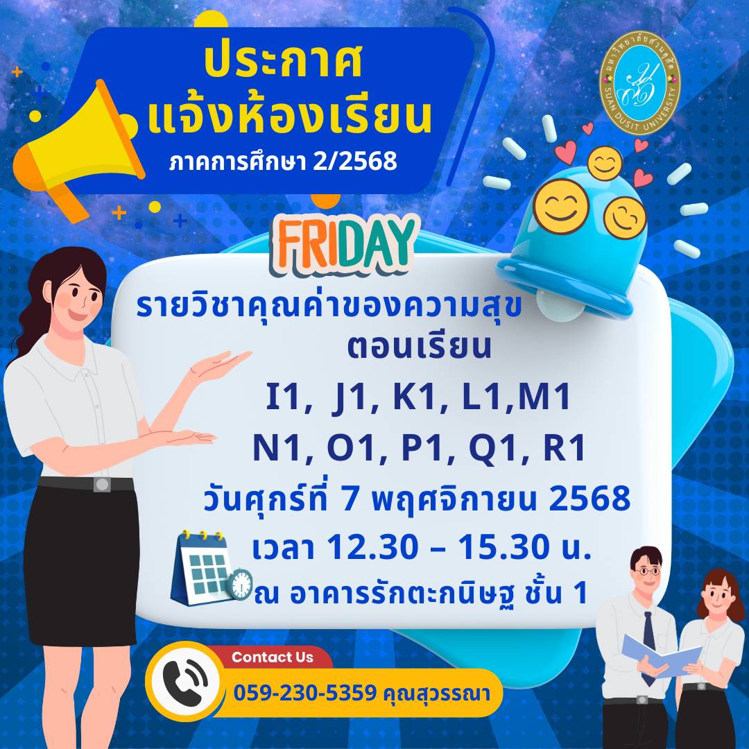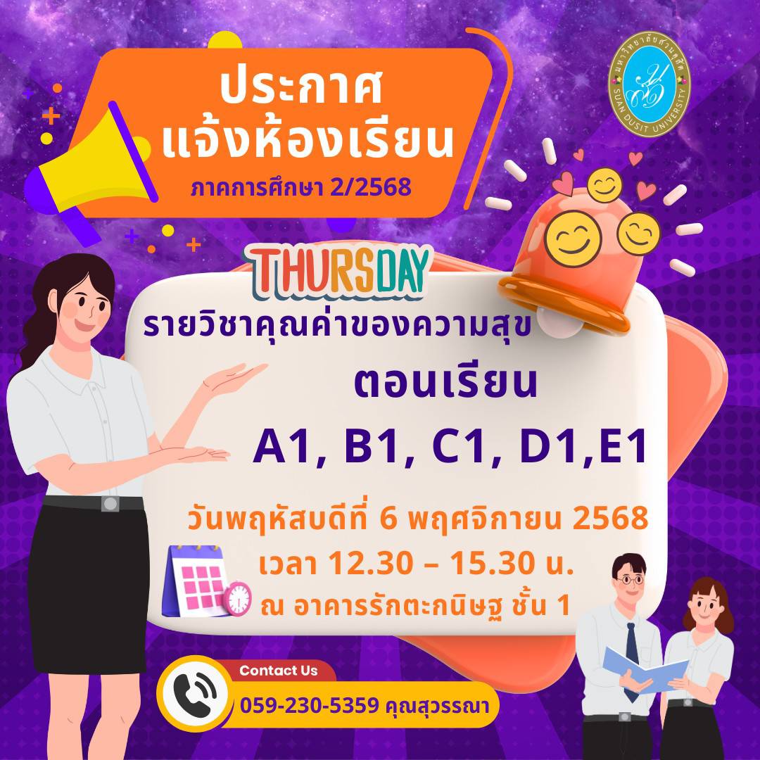 แจ้งห้องเรียน รายวิชาคุณค่าความสุข ภาคการศึกษา 2/2568