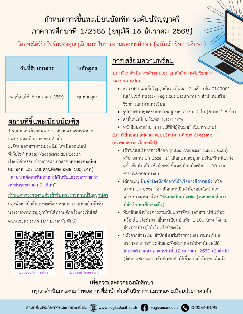 กำหนดการขึ้นทะเบียนบัณฑิต และรายชื่อผู้สำเร็จการศึกษา ระดับปริญญาตรี ภาคการศึกษาที่ 1/2568 (อนุมัติวันที่ 18 ธันวาคม 2568)