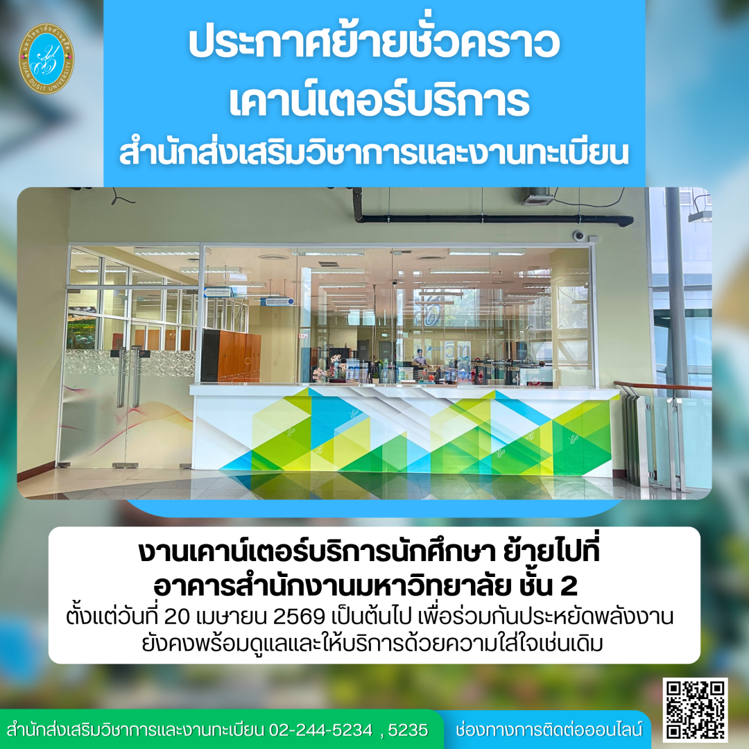 ประกาศย้ายที่ทำการชั่วคราว งานเคาน์เตอร์บริการนักศึกษา ย้ายไปที่ อาคารสำนักงานมหาวิทยาลัย ชั้น 2 ตั้งแต่วันที่ 20 เมษายน 2569 เป็นต้นไป เพื่อร่วมกันประหยัดพลังงาน ยังคงพร้อมดูแลและให้บริการด้วยความใส่ใจเช่นเดิม